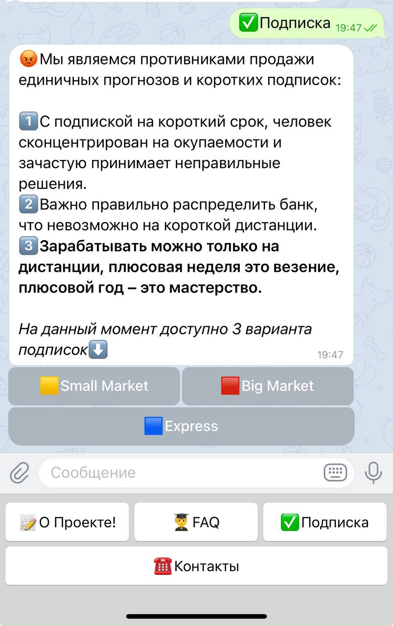 Перед тем как подробнее остановится на самих подписках, должны сказать, что у команды есть четкая позиция не продавать единичные прогнозы. Работает только в формате подписок, причем минимальная подписка предоставляется на 1 месяц.